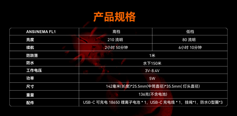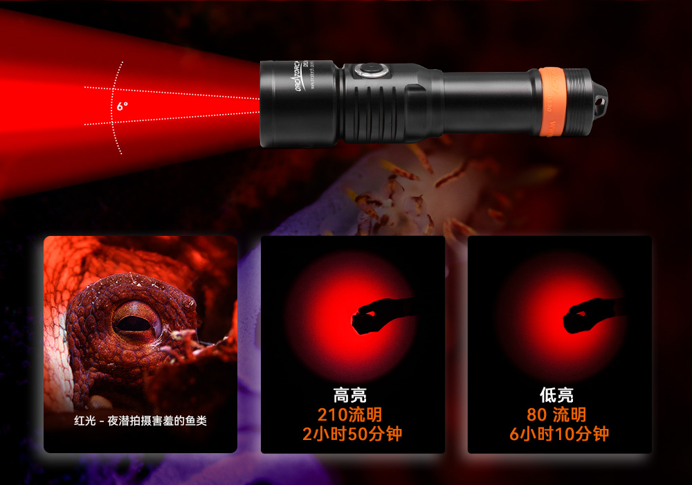 • 木瓜视频OrcaTorch D530紅光潛水燈是水(shuǐ)下攝影師必備的主光源。210流明輸出配合6°超聚焦光(guāng)束角(jiǎo),能提供遠距離高(gāo)集中(zhōng)光束,是保護人眼夜視能力(lì)的最佳(jiā)光源。采用鈦合金(jīn)側(cè)按鍵開關,設有(yǒu)高亮模式(210流明)和中亮模式(80流明)雙檔位,水下操作便捷。開關處的LED指示燈可實時顯示剩餘電量。