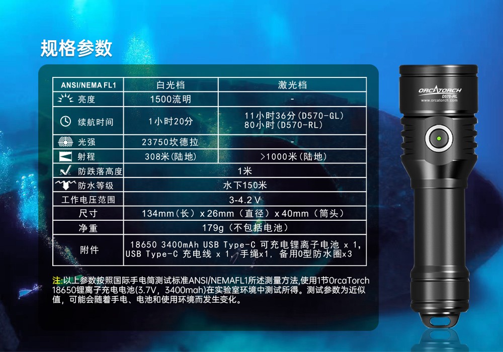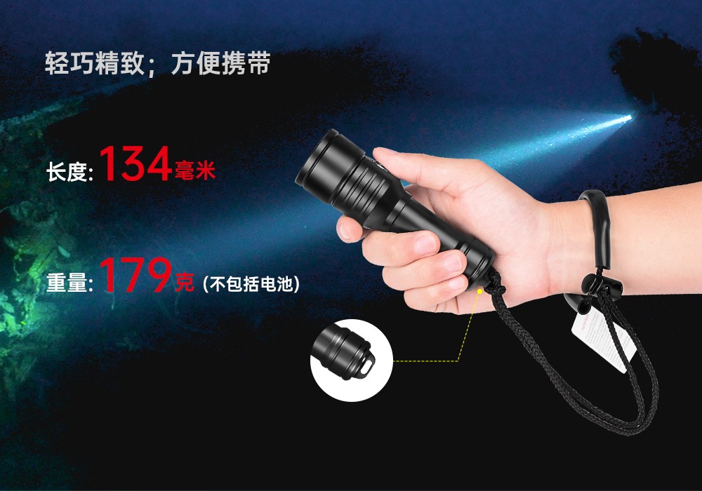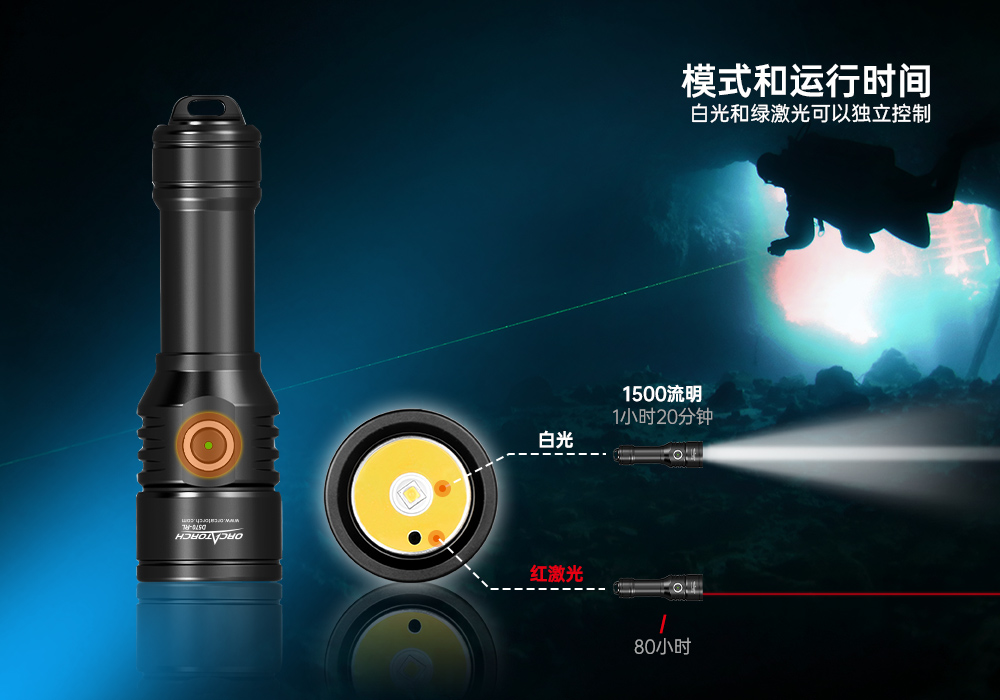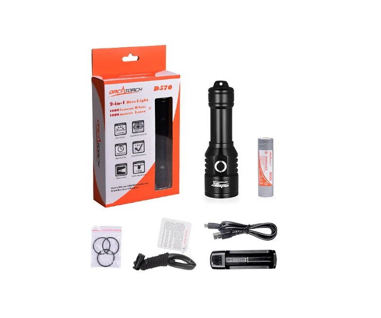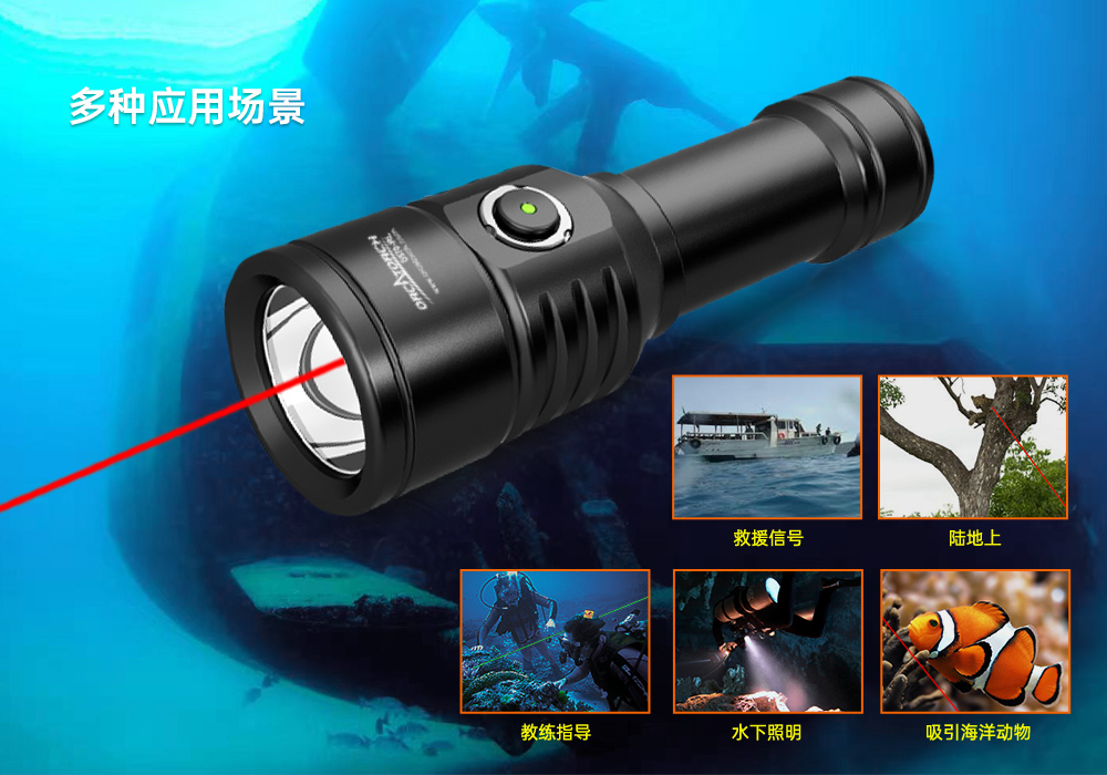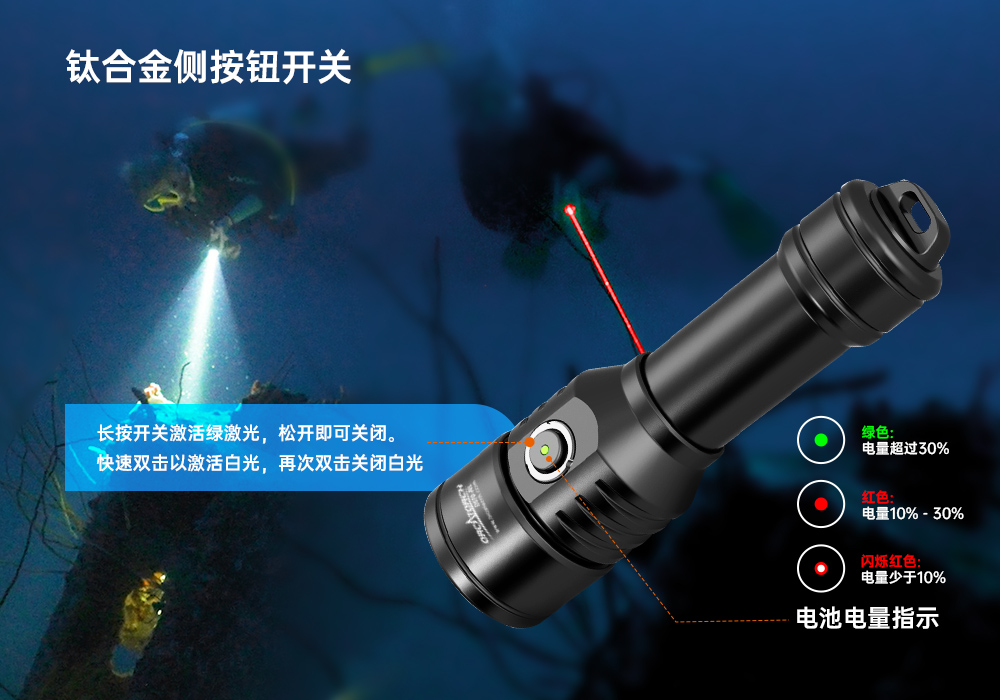 木瓜视频OrcaTorch D570-RL是一(yī)款專為休閑潛水以及商業潛(qián)水設計的1500流明潛水燈。除了常規的白光外,您可以隨時開啟激光。兩種光源可獨立控製以滿足您(nín)在不同情境下的需求。帶電量指示燈的側(cè)鍵開關提供了便捷的操控,同時(shí)讓您隨時隨地掌控剩餘電量。