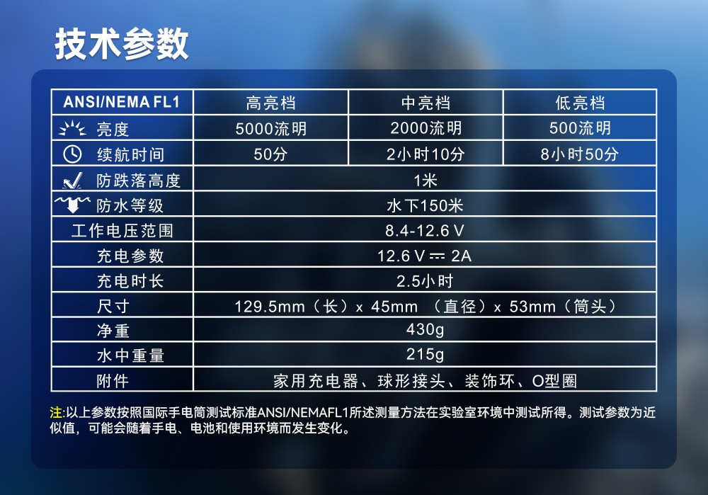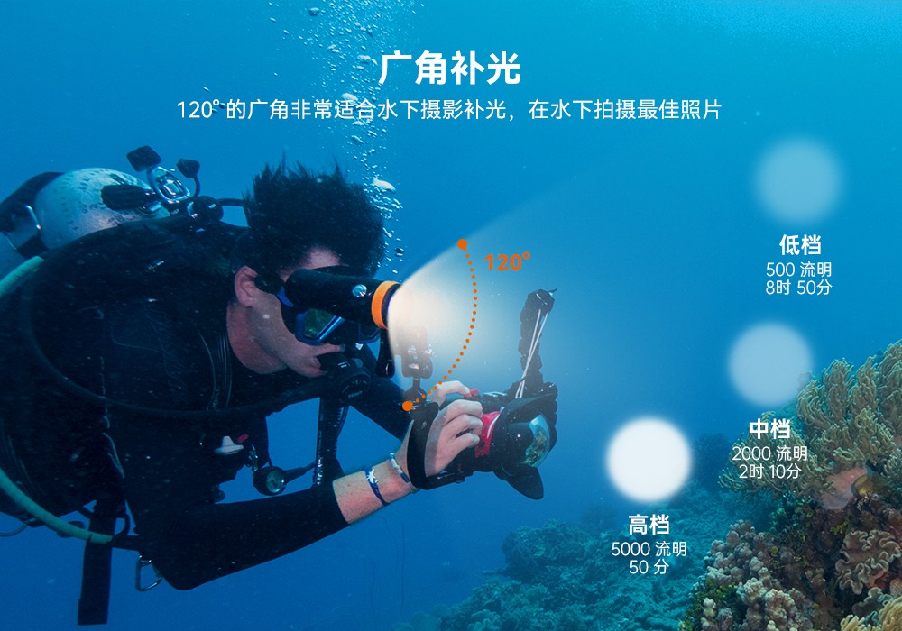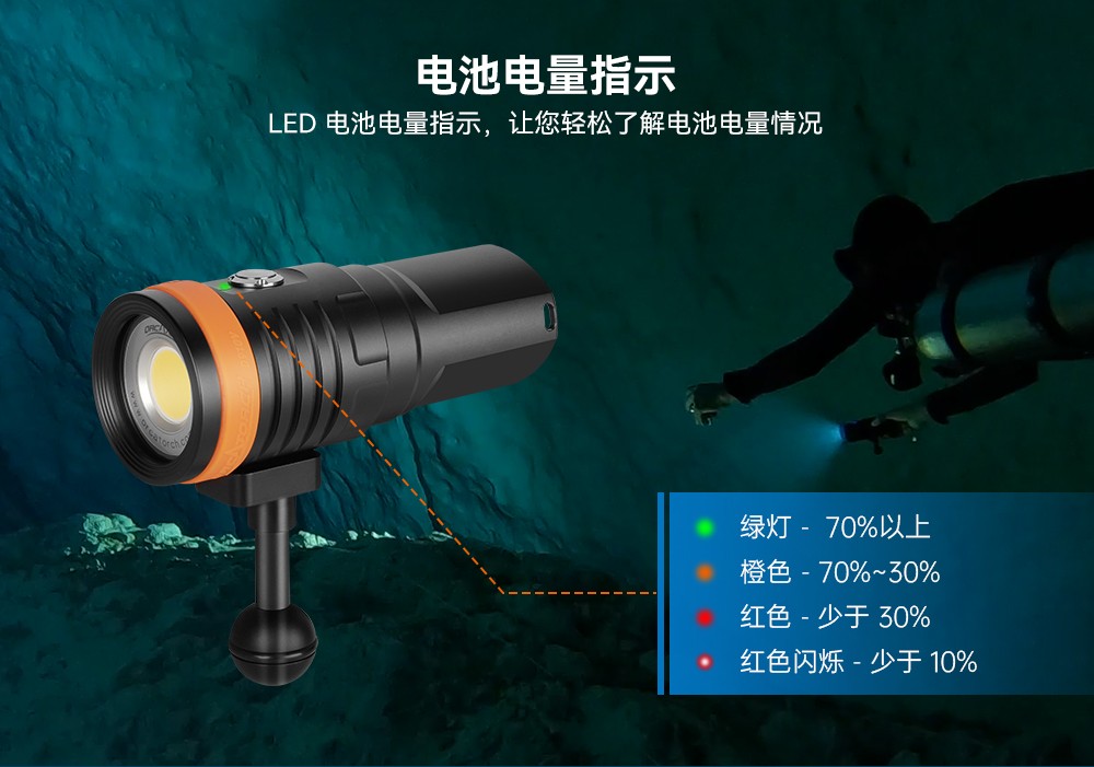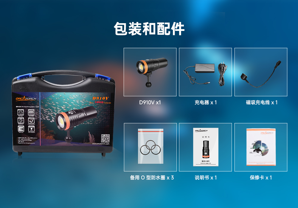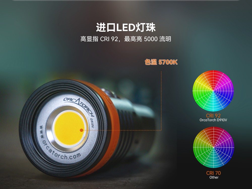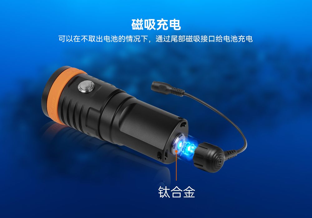 木瓜视频OrcaTorchD910V 采用進口LED燈珠,120°發光角度,發光均勻。它有3個亮度檔(dàng)位,最高亮5000流明,由鈦(tài)合金開關控製,操作簡單。行業首創磁吸式快充設(shè)計(jì),讓您無需取(qǔ)出電池即可充電。