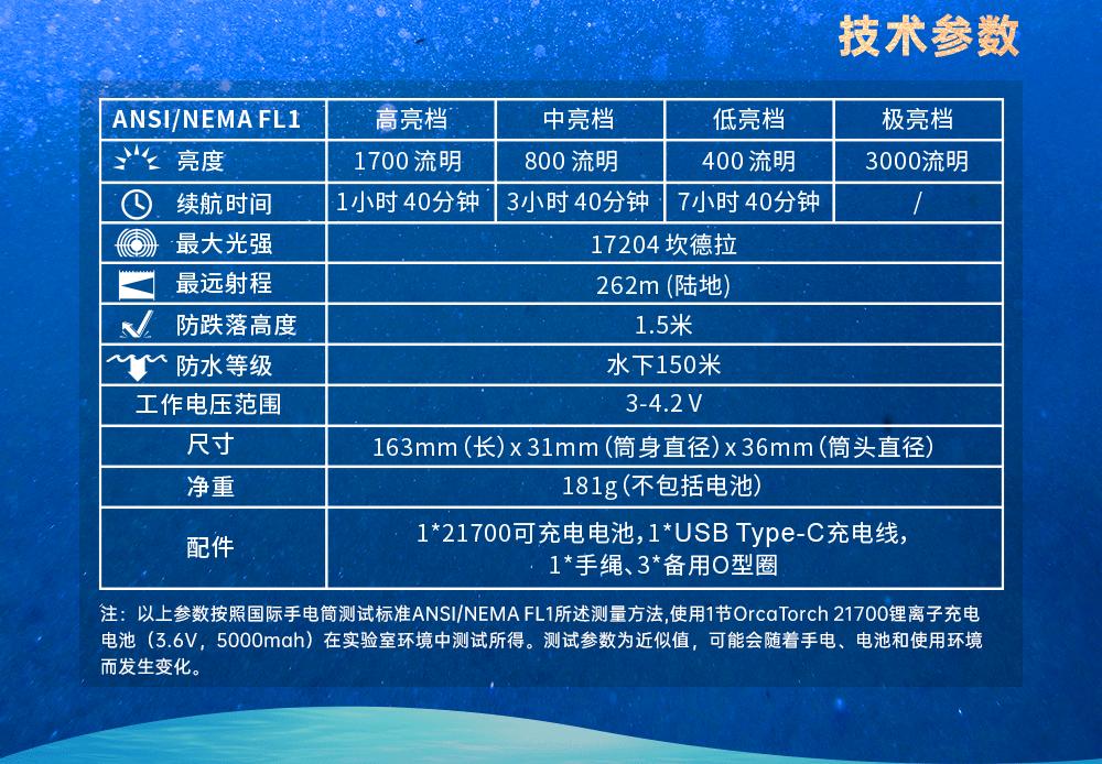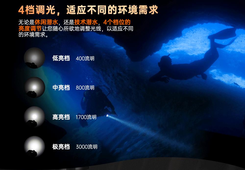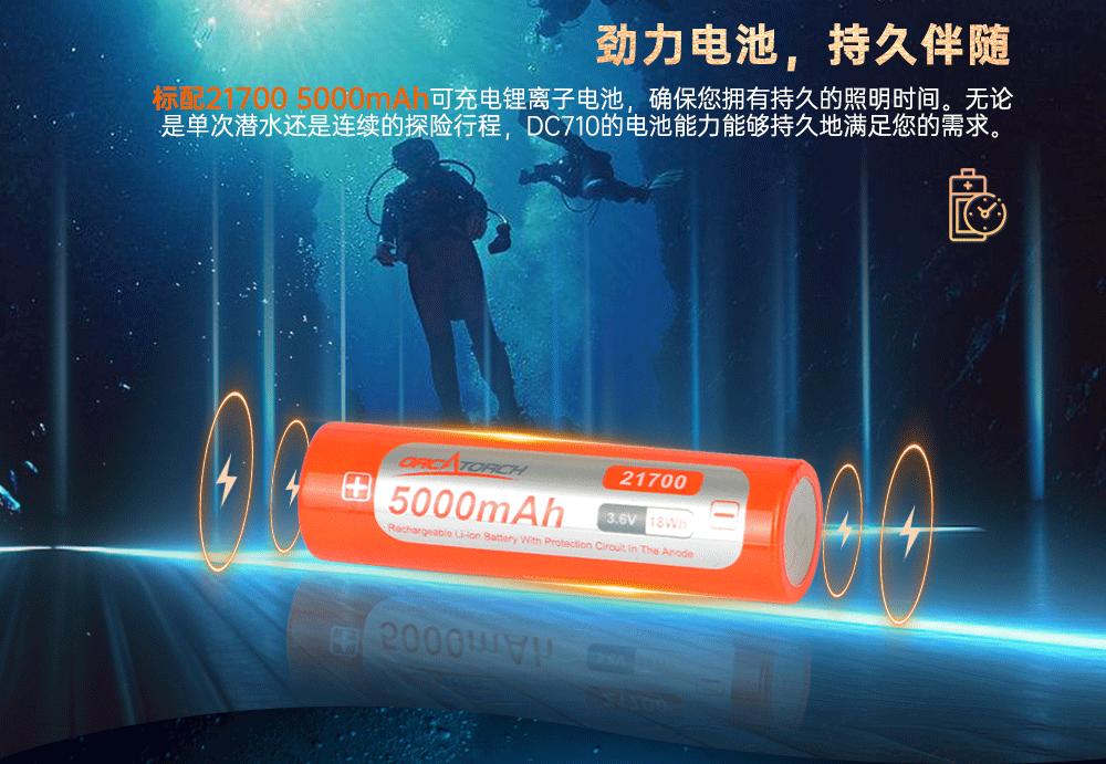 木瓜视频(jīng)OrcaTorch DC710是專為水(shuǐ)下照明而設計的(de)潛水燈。它具(jù)有USB Type-C直充(chōng)功能,方便用戶充電使用。它采用了Luminus LED燈珠,最大亮度可達3000流明。DC710采用一(yī)節21700 5000mAh鋰離子電池供電,提供可靠的電力支持。具有6度的發光角(jiǎo)度,能夠提供超級聚焦照明(míng)效果。它配備了鈦合金側麵按(àn)鈕開關,方便(biàn)操作,並且還(hái)包(bāo)括安全鎖定(dìng)功能以防止意外觸發。它在水深150米(mǐ)處能夠正常工作,為潛水員提供可靠的照明解決方案。
